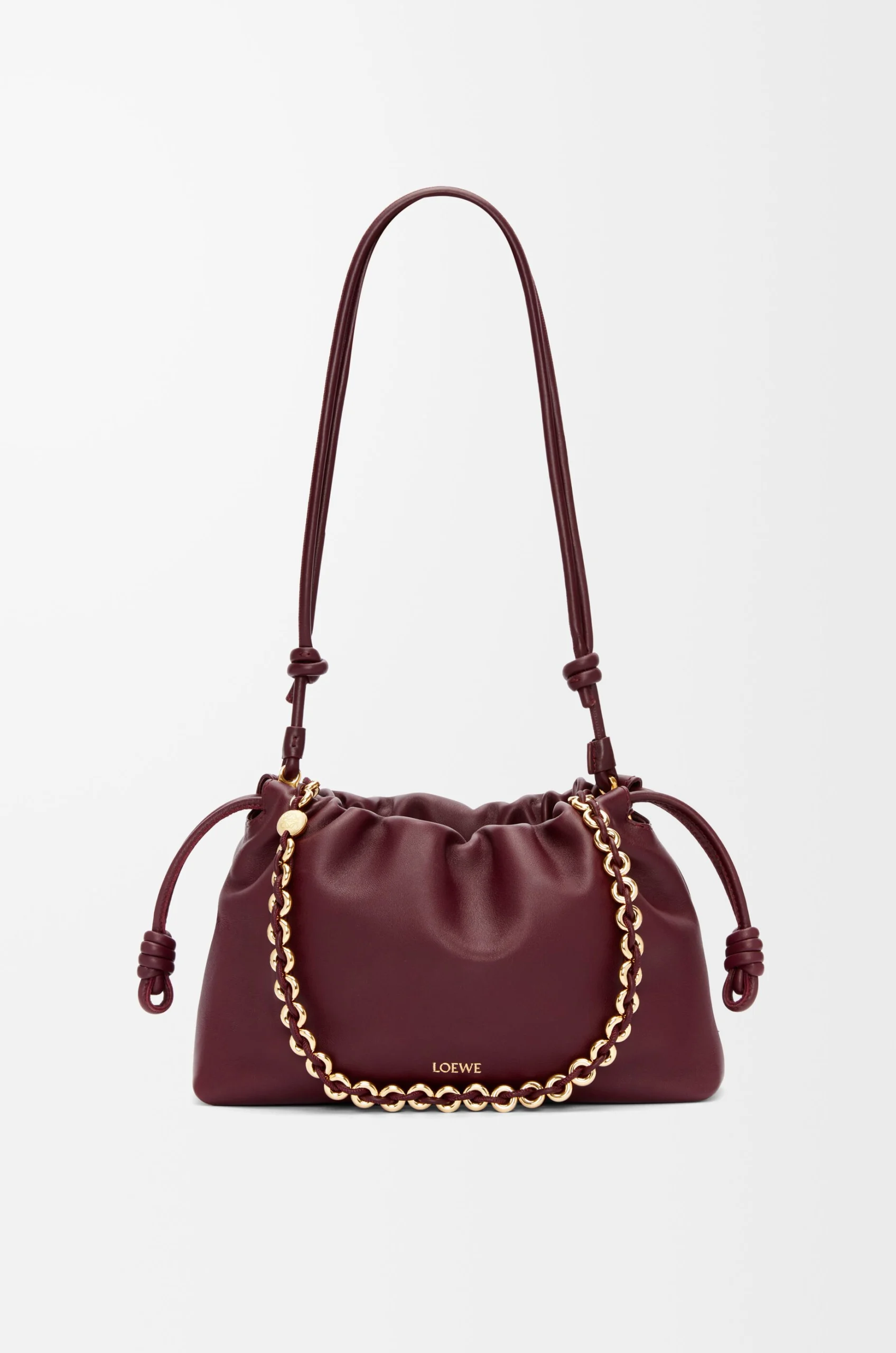 The Flamenco purse is a lightweight and soft bag with a ruched shape, historical knot drawstrings and a donut chain. This medium