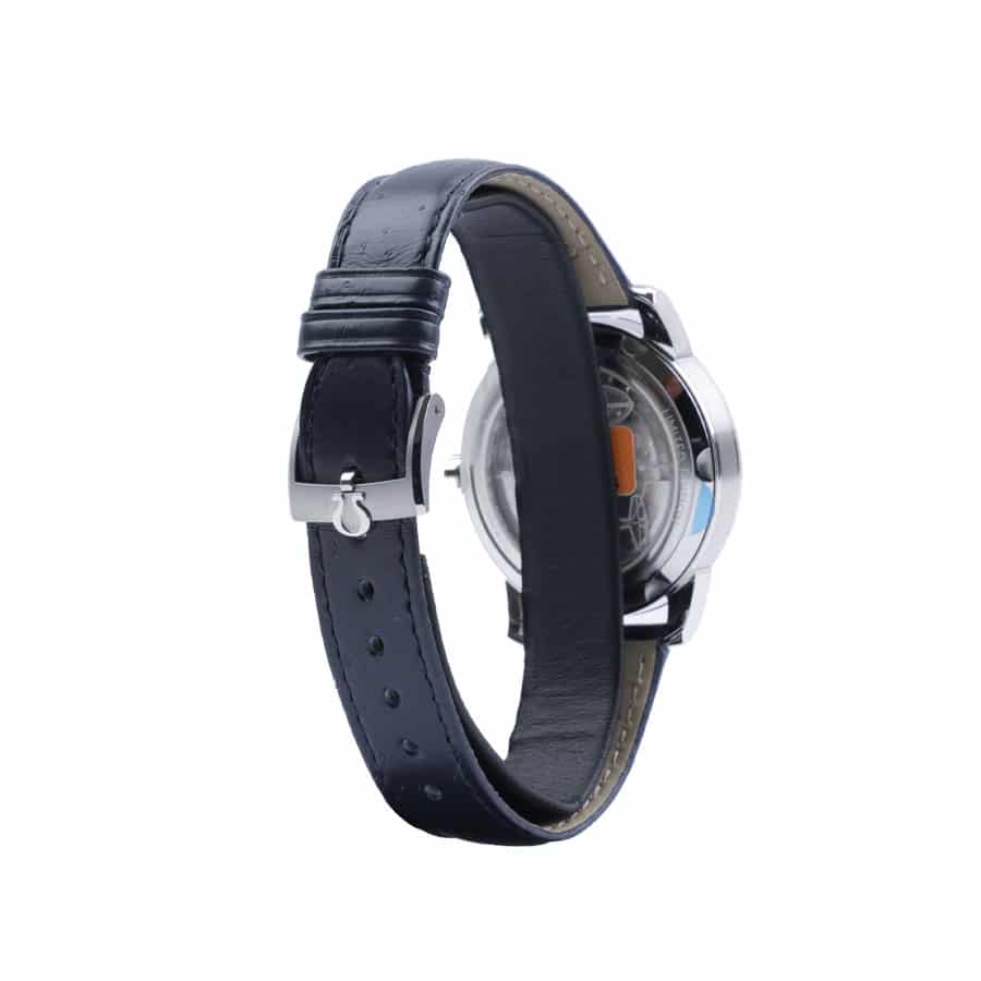 has a sapphire crystal. The bracelet is made of leather and has adjustable links. The dial is silver with mixed indices and stick
